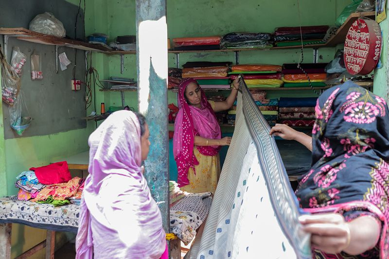 Minara in her shop in Dhaka, surrounded by the fabrics that saved her family from starving both in Barguna and Dhaka. © BRAC 2023