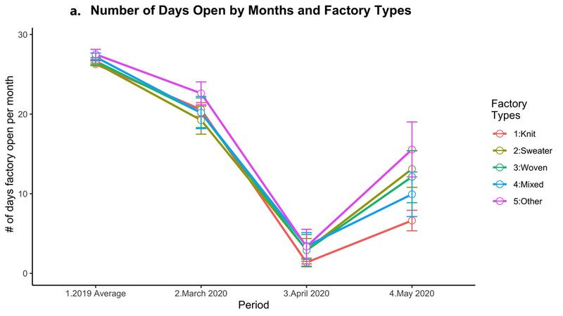 At the time of the survey, 86,697 workers were being employed in the surveyed factories while a total of 58,000 workers were laid off (on average 226 workers per factory) due to the pandemic.