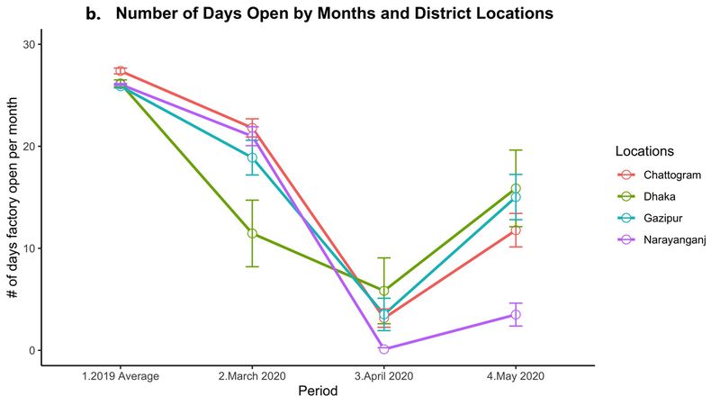 As per the research findings, 82.6% (370) non-member factories among 448 surveyed factories were operational at the time of the rapid survey (during mid-June 2020). In April, the factories were open on average for only 2.3 days. By May, factories slowly started to open and operated for approximately 9.6 days.