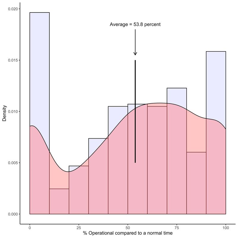 For the whole sample (n = 448), the average capacity utilisation was 53.8% and about 65.2% conditional on being open (n = 370) at the time of the survey, where the woven factories exhibited higher levels of capacity utilisation (70.8%), compared to knit (65.2%) and particularly sweater factories (56.5%).