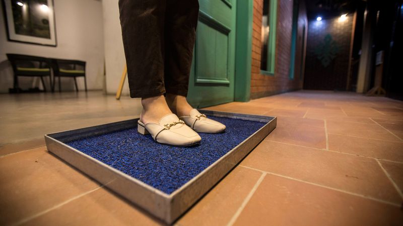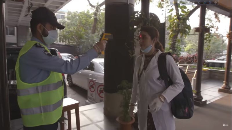 The entrance to the head office has makeshift pavements drenched in disinfectants, allowing the staff to walk on them and sanitise their shoes before entering the building. While doing that, security personnels check the body temperature of every employee with thermal scanners before allowing them inside.