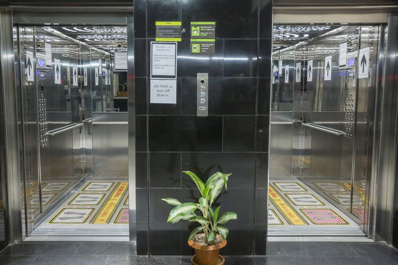 When the staff members finally get to reach the elevators in the lobby area after following those protocols, no more than four people can be inside an elevator simultaneously. It is tricky to maintain social distancing in tight, enclosed spaces like elevators, hence the ones in BRAC have been marked into mini-zones, instructing the staff to stand inside the boxes while facing towards the elevator walls and away from each other.