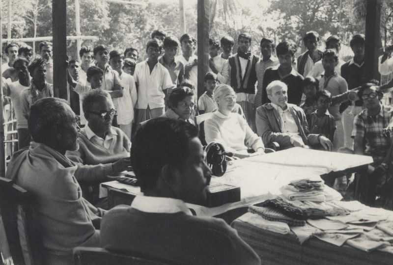 Abed (pictured seated in the middle) with visitors during the early years of BRAC.