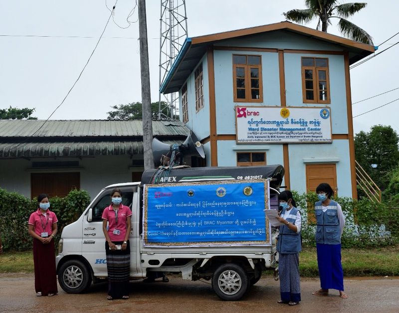 BRAC Myanmar staff raising awareness in front of the ward disaster management centre, constructed and managed by BRAC.