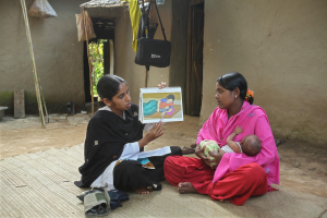 A shasthya kormi counselling a mother on child health and nutrition