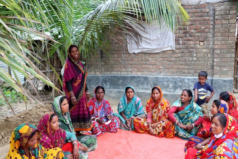 Panmoni Pahan, seen standing, conducting a monthly meeting with the members of the village development organisation in her community. Photo credit: Alpona J Kujur © BRAC, 2022