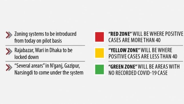 The government has shortlisted a total of 45 areas in Dhaka under the red zone, according to recommendations by the national technical committee formed to tackle the spread of COVID-19. A zone will be declared red if 40 or more people per 100,000 in a unit tests positive in a 14 day period. The work on identifying the units in the urban space is ongoing. Outside of Dhaka, the three-coloured zones are now applicable down to union-level administrative locations.