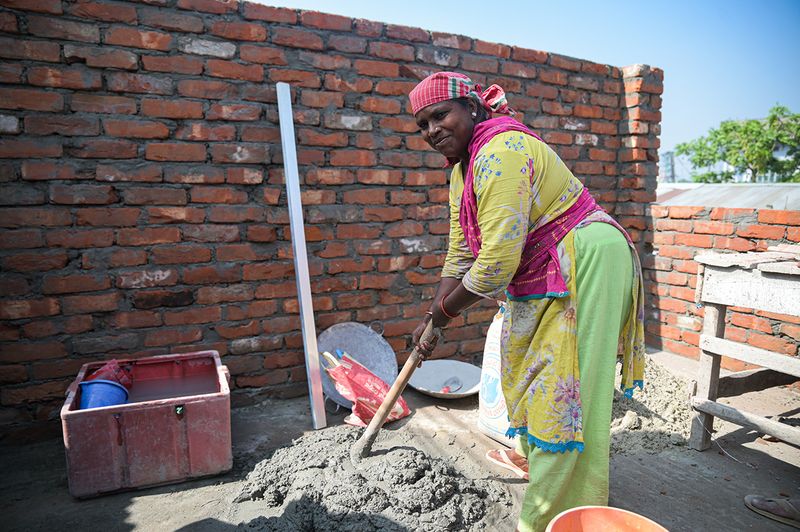 Shayera Begum poses for a photo while mixing cement plaster in her construction site. © BRAC 2023