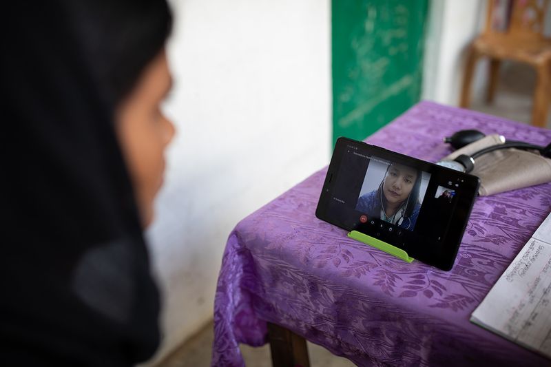 Popi Akhter, who lives in the remote haor region of eastern Bangladesh, consulting a doctor about her health issues through a video call. Photo credit: Fahmida Hashin © BRAC 2022.