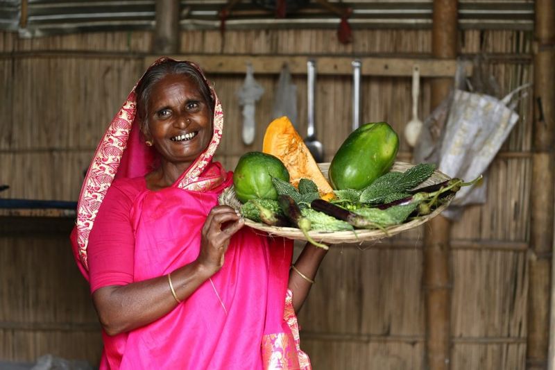 Meherjan with vegetables from her kitchen garden in Rangpur, northern Bangladesh. She enrolled in our ultra poor programme in 2006 and graduated in 2007, now earning by rearing cattle.