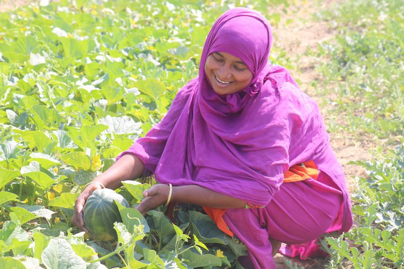 An Ultra-Poor Graduation programme participant in Bangladesh inspects produce from her field. Photo credit: Pronob Ghosh © BRAC
