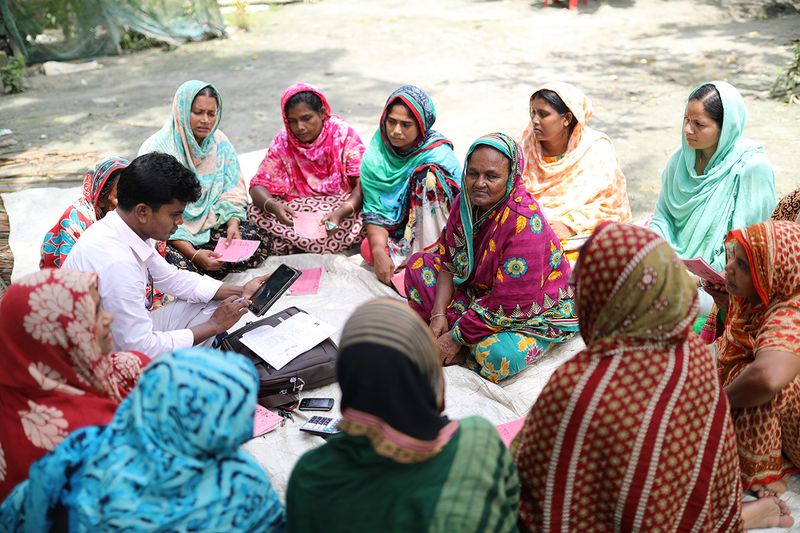 BRAC programme officers listening to clients and clarifying their doubts about mobile money in a village organisation (VO) meeting. © BRAC 2023