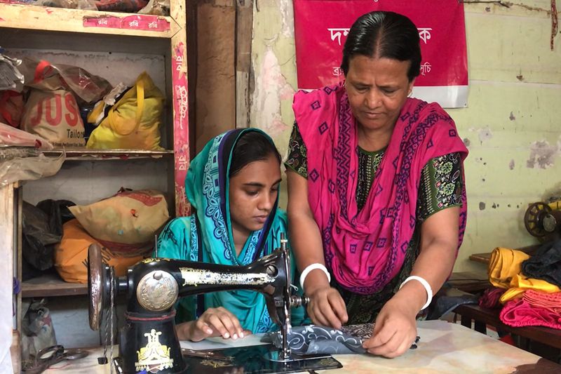 Shathi is learning how to sew a collar from mastercraft women Alpana, who has more than eight years training experience and owns a tailoring shop in Dhaka.