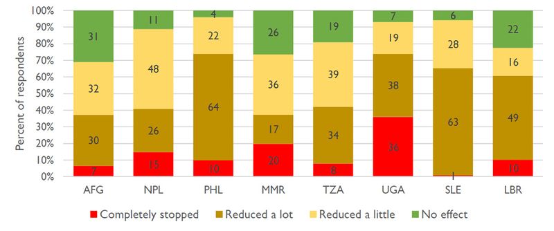74 respondents in Uganda and the Philippines reported either a complete loss of income or a significant reduction. In Afghanistan, which has experienced the lowest impact on income overall, 69 respondents had suffered from some form of income reduction.