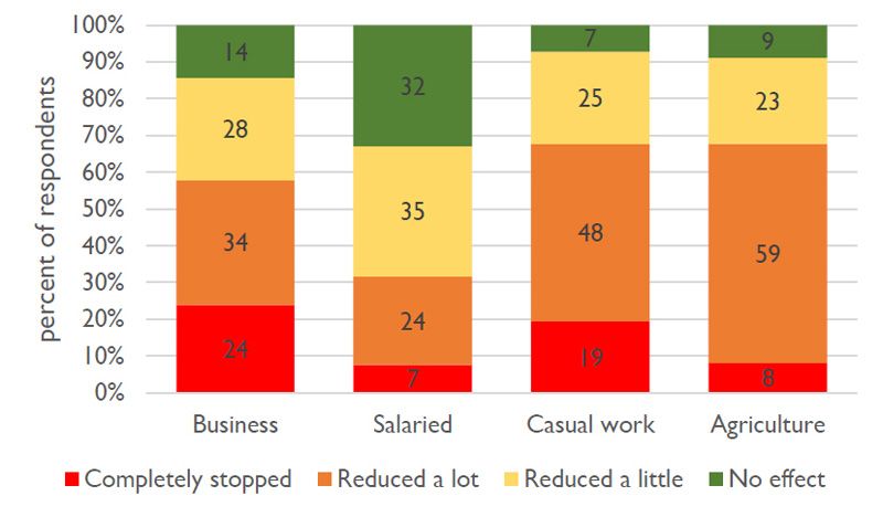 91% of agricultural workers and 93% of casual workers experienced some sort of loss of income. 86% of those working at small businesses suffered similarly.