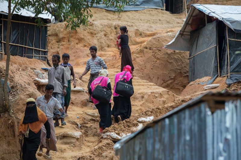 Outreach workers walking uphill in the informal settlements of Kutupalong, Cox’s Bazar.