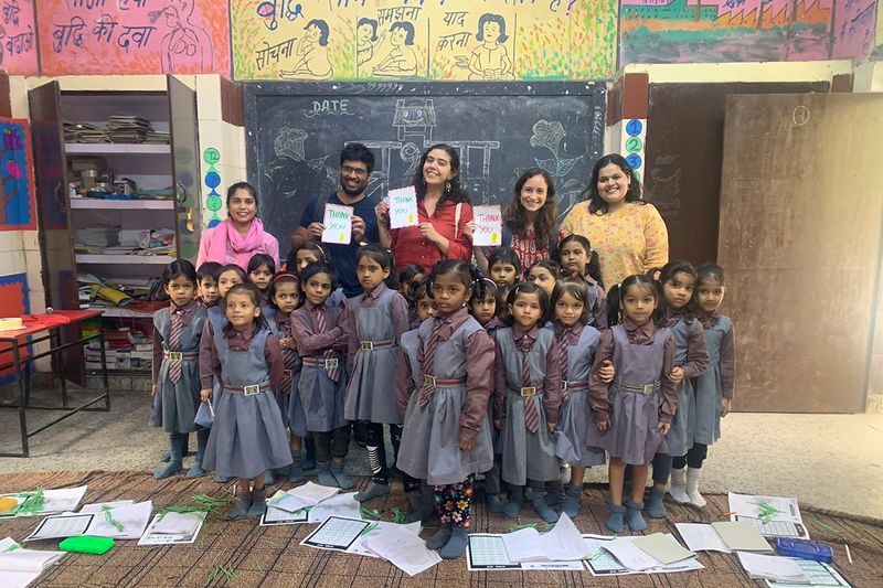 Caption: (left to right) Siddhant Gokhale and Jossie Fahsbender with teachers and students from Pratham’s Teaching at the Right Level program in Delhi, India, November 2023 © Siddhant Gokhale 2023