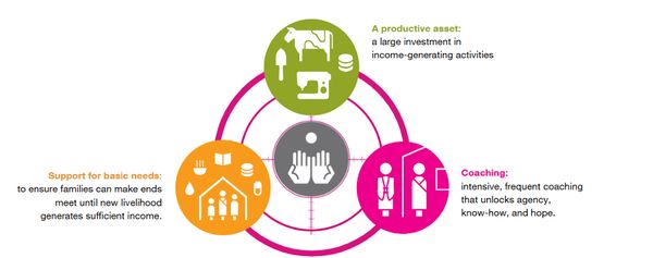 This is now most often delivered as a labeled lump sum cash payment, but was historically a physical asset (a cow, some goats, a sewing machine, or start-up capital for a corner store, for example). Researchers we spoke with emphasized that the important thing is that the asset transfer be big enough to be able to generate income – a good rule of thumb is the local value of two goats, but there is no magic size. The investment is also typically accompanied by enterprise development and money management skills provided by a coach to increase the likelihood of livelihood success (more below). - Basic needs: Support to stabilize participating households.