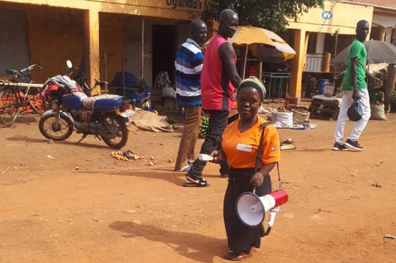 A NUWODU staff member using a megaphone to deliver messages on social distancing and hygiene.