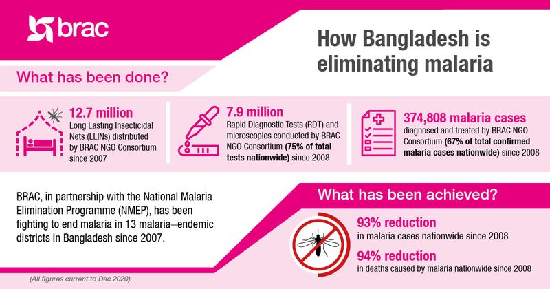 BRAC’s initiatives to end malaria in Bangladesh began in 1998 in the Chattogram Hill Tracts. A grant was received from the Global Fund to Fight TB, AIDS and Malaria, and the BRAC Malaria Elimination Programme was expanded, in partnership with National Malaria Elimination Programme (NMEP) in 2007. The Programme led a consortium of non-governmental organisations as the principal recipient of the grant, and strengthened its malaria-fighting activities in 13 malaria-endemic districts of Bangladesh.