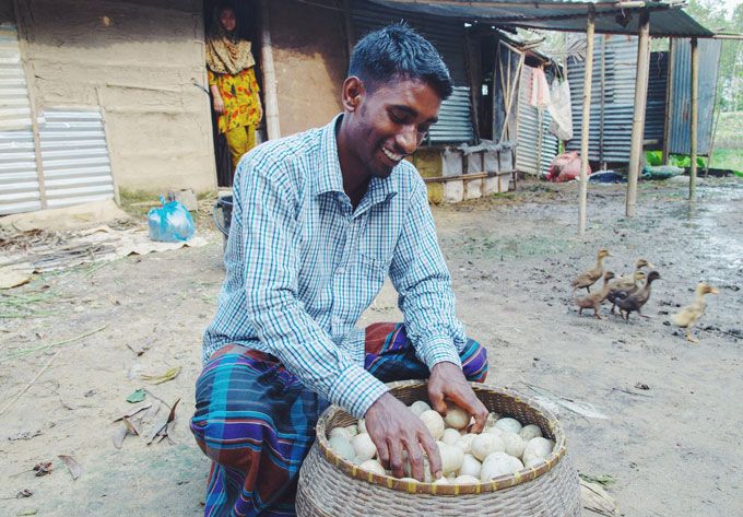 Ibrahim is a resourceful young man with his sense of identity deeply rooted in his land. His family had always been involved in farming, but he embraced the opportunity to take their involvement further. As a member of the VDO, he had access to training on agriculture and duck rearing, and loans to buy his ducks and start his own commercial cultivation. Now he earns over USD 150 (BDT 12,080) every week from selling duck eggs, and through his link to Shwapno, a giant supermarket chain, he sells his produce at a rate of USD 240 to 400 (BDT 3 to 5) higher than the market price.