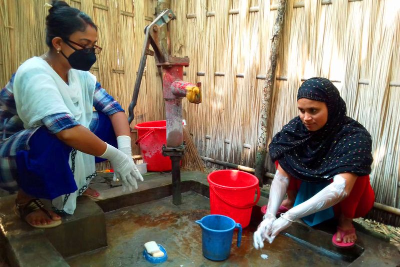 BRAC UPG staff shows proper handwashing techniques to a participant.