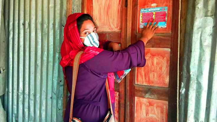 BRAC staff posting COVID-19 health and safety guidelines around communities.