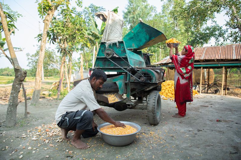 Shefali Begum, another participant of the Ultra-Poor Graduation programme, working with a maize processing machine she bought with a loan from BRAC. Photo credit: Abdullah Al Kafi © BRAC