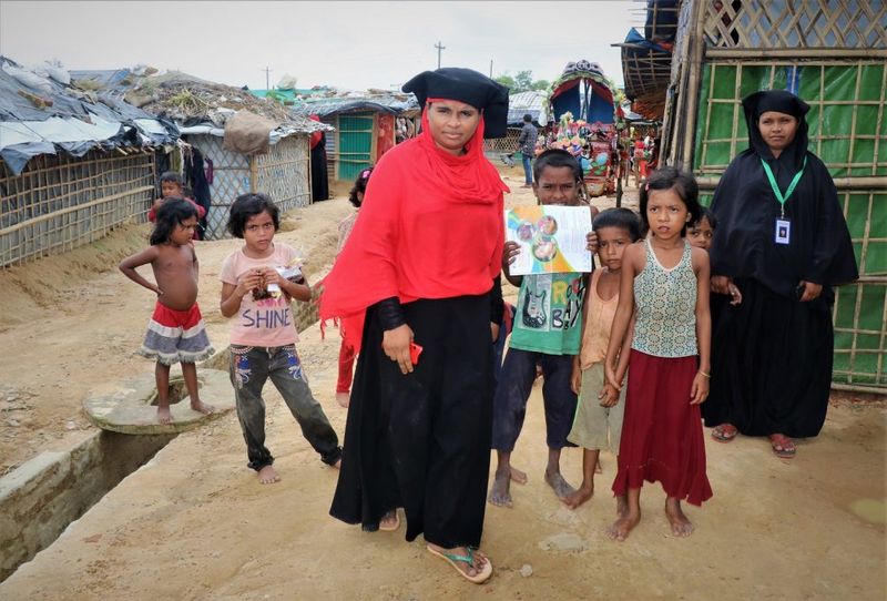 The dark grey skies overhead could not dim the welcoming smiles of the staff on the ground. Nutrition workers and volunteers were kitted in the brightest orange t-shirts and caps for this year’s Nutrition Action Week here in the makeshift settlements in Cox’s Bazar.