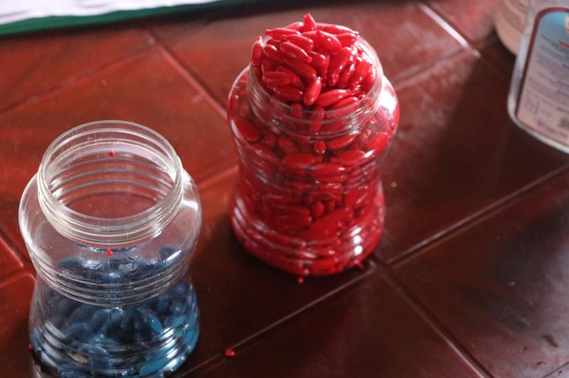 They looked on, curiously, at the various instruments that measure weights and heights, and the jars of vivid red and blue vitamin pills.