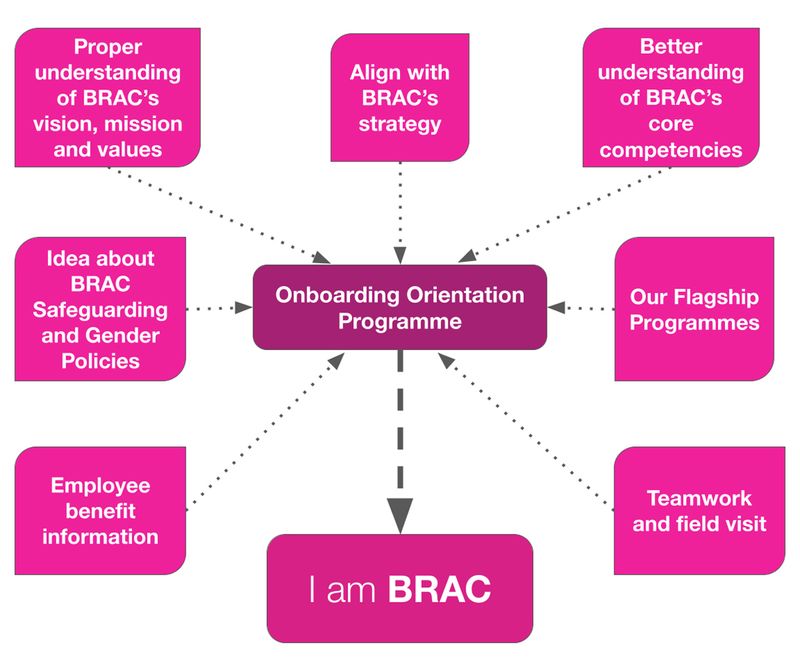 The current month-long orientation programme is mainly for the head office-based new employees. It begins with a warm welcome from the Director of BRAC’s communications, learning and leadership development department. Following that, the participants are introduced to BRAC’s values and different flagship programmes. The onboarding unit also arranges a session with the Executive Director of BRAC to onboard everyone with the organisation’s goal. We also have an online platform “BRACIPEDIA” where participants complete a course on “BRAC Strategy” to have a clear understanding of BRAC’s delivery approach, the four programmatic pillars, and help participants understand BRAC’s development priorities. Finally, the orientation programme ends with teamwork and presentations where participants share their understanding of BRAC through this month-long journey. Additionally, the top performers receive certificates upon completion of their onboarding, which motivates them to know more about the organisation.