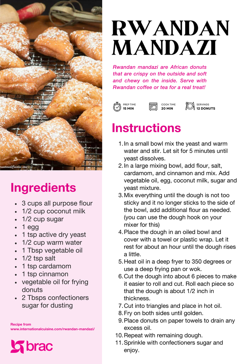To show our appreciation, we have something sweet to share with you: a recipe for mandazi, fried pastries that are sometimes referred to as “African donuts.” Try them plain, or dress them up with cinnamon, honey, jelly, or powdered sugar. If you make this recipe, take a photo and send it to us (or tag us on social media). We’d love to see how your mandazi turn out!