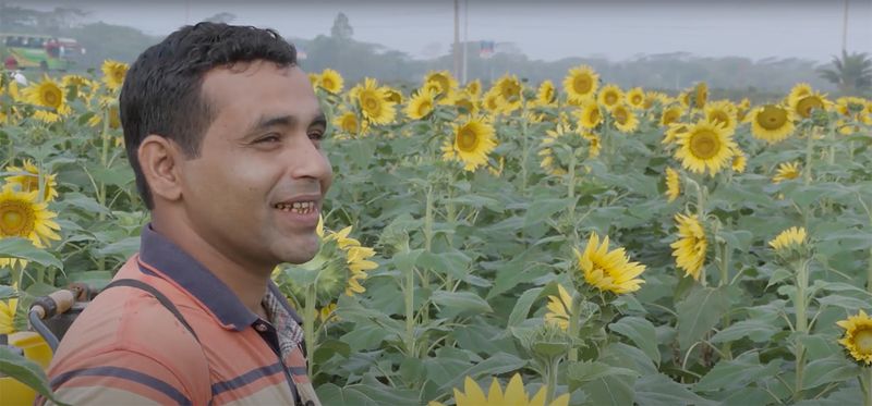 The yellow petals of the sunflower catch the eyes of visitors, but for farmers like Ashim, it’s the black circle in the middle that makes them smile. The bigger the circle, the higher the yield of sunflower oil. © BRAC 2023