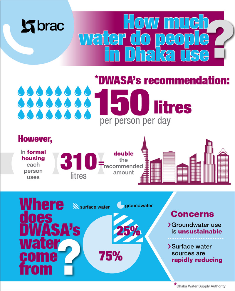 Dhaka Water Supply & Sewerage Authority (WASA) recommends that each person in Dhaka uses 150 litres of water per day. The State of Cities report shows that each person living in formal housing in Dhaka uses an average of 310 litres per day, or double this amount. On the other hand, people living in informal housing use an average of 85 litres per day, or half this amount.