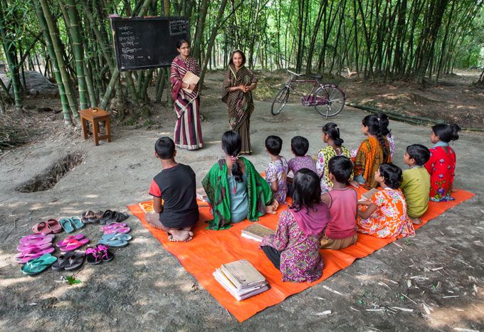 It is a weekday afternoon in Moulvibazar, Rangpur, and the melody of children chanting times tables is wafting through the trees. School is over, but students are gathered under shady trees in the village courtyards for another round of lessons. Not just in this village, but in many others nearby as well. It is not the work of any organisation. This network of open-air classrooms is all due to the initiative of one barely literate woman.