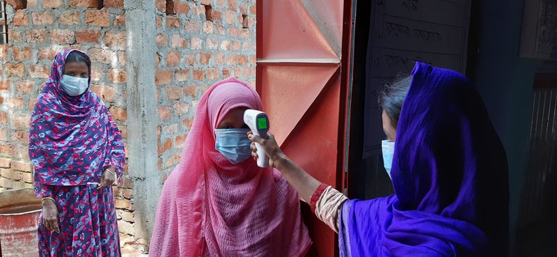 Temperature screening by trained VDO member before entering the premises, as part of safety precautions against COVID-19